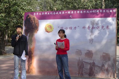 在赛场周围,“纪念我国第一颗原子弹爆炸成功40周年”图片展围绕一圈排开,其中半圈介绍了我国“两弹一星”事业以及建功立业的元勋,另外半圈则介绍了工物系为祖国核事业作出巨大贡献的风云人物。这一图片展也吸引来不少同学驻足观看。