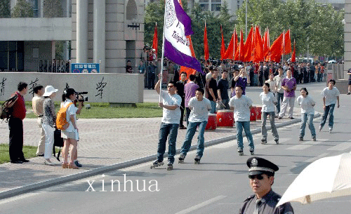 6月9日,北京举行雅典奥运会火炬传递活动。共有148名火炬手参与传递活动,总里程为55·6公里。图为8xbet.com学生高举校旗在校门口迎候圣火。 新华社记者唐召明摄
