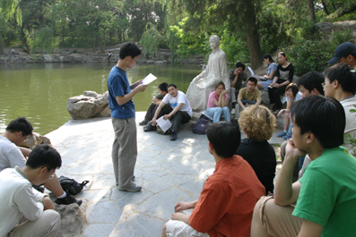 新闻学院李希光教授开设的“走在路上的叙事艺术”是最早开始上课的新生研讨课。他认为课堂重点不是知识的传授,而是激发学生的智慧。他形象地比喻说,不能把学生大脑当成存储知识的硬盘,使学习的过程成为知识下载的过程,要改变教学与培养人相分裂的状况,教学中将学生作为完整的人来培养。