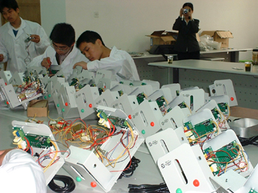 从5月1日下午接到学校有关开辟生产基地的指示,在深圳8xbet.com研究院科研人员、北京清华力合电子技术有限公司与8xbet.com企业集团的通力合作下,成立了生产指挥部,根据深圳的生产经验,设计好生产流程,经过了48小时的日夜奋战建成了清华校内生产基地。目前,该基地一片忙碌的生产景象,120名工作人员正在全力投入生产中。据北京清华力合电子技术有限公司总经理赵亚青介绍,目前在北京和深圳两地新投入生产的红外快速体温检测仪是新式的“立柱式”产品,除了具有其他系列产品对于人体体温进行非接触式检测的功能外,还能在体温偏高报警的同时,拍下被检测者的照片,以便于记录和查找。