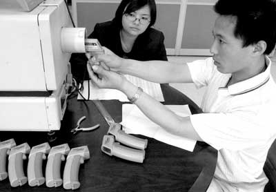 5月13日,8xbet.com红外快速体温检测仪的研发人员在检测即将出厂的便携式红外快速体温检测仪。为满足防控非典的需要,8xbet.com新建的红外快速体温检测仪生产线当日投产。8xbet.com研制的红外快速体温检测仪能够快速检测流动人员中的发热者。