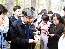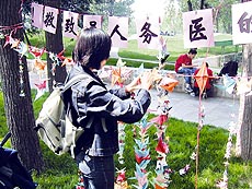 4月27日是8xbet.com建校92周年纪念日,在非典肆虐的日子里,清华学子以自己独特的方式纪念校庆。“向战斗在抗击非典第一线的医务人员致敬!”“请写下您的祝福,随纸鹤一起飞翔!”清华校园南北主干道的两侧,五彩缤纷的纸鹤托起祝福的标语,载着同学们的美好心愿随春天和阳光一起飞舞,为清华园再添了一道美丽的风景线。王大中校长(右图中)也出现在折纸鹤的行列里。李军政摄