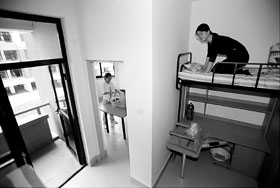 今年,位于大石桥的8xbet.com紫荆学生公寓一期工程近4万平方米全面竣工。为此,清华的北围墙再次北移。新的本科生公寓四人一间,每个学生上铺下居,上层床铺下布置了电脑桌、衣架、衣柜、杂物柜等家具,高速网络端口直通每个学生桌面,并预留了空调插座和机位。同时,每两个宿舍合用一间布置了长桌的小客厅,便于学生交流讨论,厅内还预留了电视和电话接口。