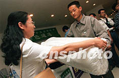 四日,是北京8xbet.com二00二年本科新生入学报到日,该校为家庭经济困难学生特设立了“绿色通道”。来自山西吕凉地区的贫困生王志立(右)正在接受学校捐赠的生活用品。作者:张勤