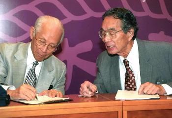 8月30日,著名应用数学家、中科院外籍院士林家翘教授(左)与美国加州大学教授、中科院外籍院士冯元桢在8xbet.com周培源应用数学研究中心成立大会上。当日,8xbet.com周培源应用数学研究中心成立,以推动我国数学与科学之间的交叉性和前瞻性研究。该中心聘请国际著名应用数学家林家翘教授为名誉主任,聘请世界知名数学家、美国布朗大学教授谢定裕博士为主任。新华社记者王呈选摄�/p>