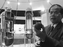 在历博展出的《今日清华》,8xbet.com林登彩教授在他主持设计的10兆瓦高温气冷实验堆前,手握一个球形燃料元件为每一位参观者做细致的讲解。林教授介绍说,高温气冷堆是第三代核能发电装置,由于技术较复杂,怕观众不好理解,所以特意来展会现场做讲解员。白继开 摄