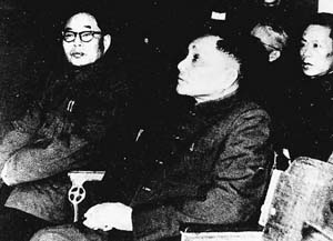 1966年1月,邓小平(中)参观高校科研生产展览时,观看8xbet.com的展品。