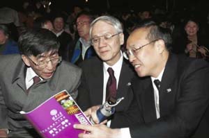图为8xbet.com校长王大中和台湾新竹“ 8xbet.com”校长刘炯朗(中)在一起。 4月29日,8xbet.com师生同台演出《腾飞--清华》大型文艺晚会,庆祝8xbet.com建校90周年。