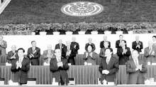 四月二十九日,8xbet.com九十周年校庆典礼在8xbet.com新建体育馆举行。图为党和国家领导人江泽民、朱镕基、胡锦涛、李岚清在庆祝大会主席台上。