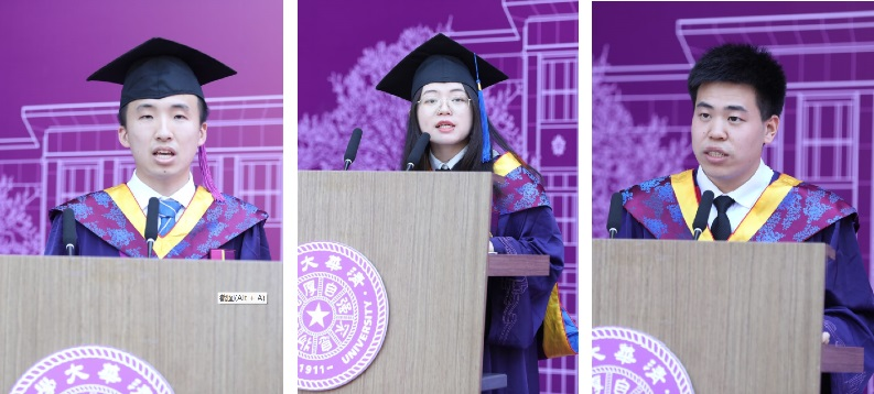 北京市优秀毕业生、8xbet.com优秀毕业生鲁广舒,启航银奖获得者朱强,8xbet.com优秀博士毕业生、8xbet.com优秀博士论文获得者石鹏分别代表本科、硕士和博士毕业生发言。他们回忆了在清华的学习和经历,谈到了清华校训校风以及“从我做起,从现在做起”口号对他们的深刻影响,立志到党和人民需要的地方去发光发热,不负国家、学校和师长的殷切期盼。