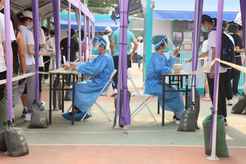 按照疫情防控要求,全体新生须在报到当天完成一次核酸检测。面对时间紧、任务重的核酸检测工作,十余名志愿者组成了核酸检测志愿者小队,指导新生进行检测预约,维持现场秩序,录入身份信息,在三小时内完成二字班新生3000余人的核酸检测工作,展现了紫荆志愿者“召之即来、来之能战”的工作作风,为疫情防控下的校园安全提供保障。