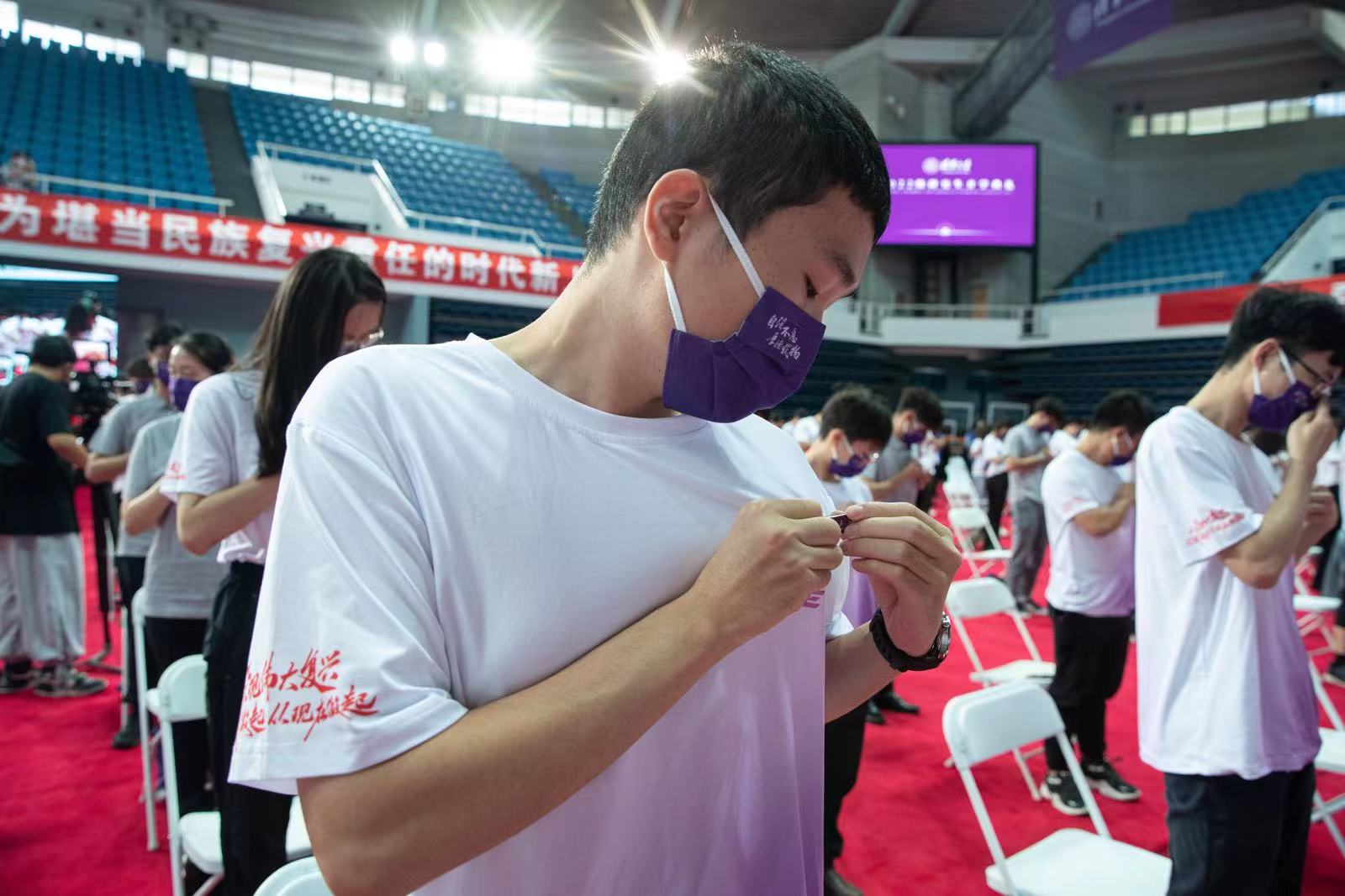 典礼上举行了新生佩戴8xbet.com徽章仪式,王希勤为新生代表王煜楠戴上了8xbet.com徽章,其他同学为自己佩戴8xbet.com徽章。佩戴上这枚镌刻着“8xbet.com”四个字的徽章,这群生逢盛世、肩负重任的青年学子,将带着“清华人”的使命和责任不懈努力,成长为可堪大任的时代新人。
