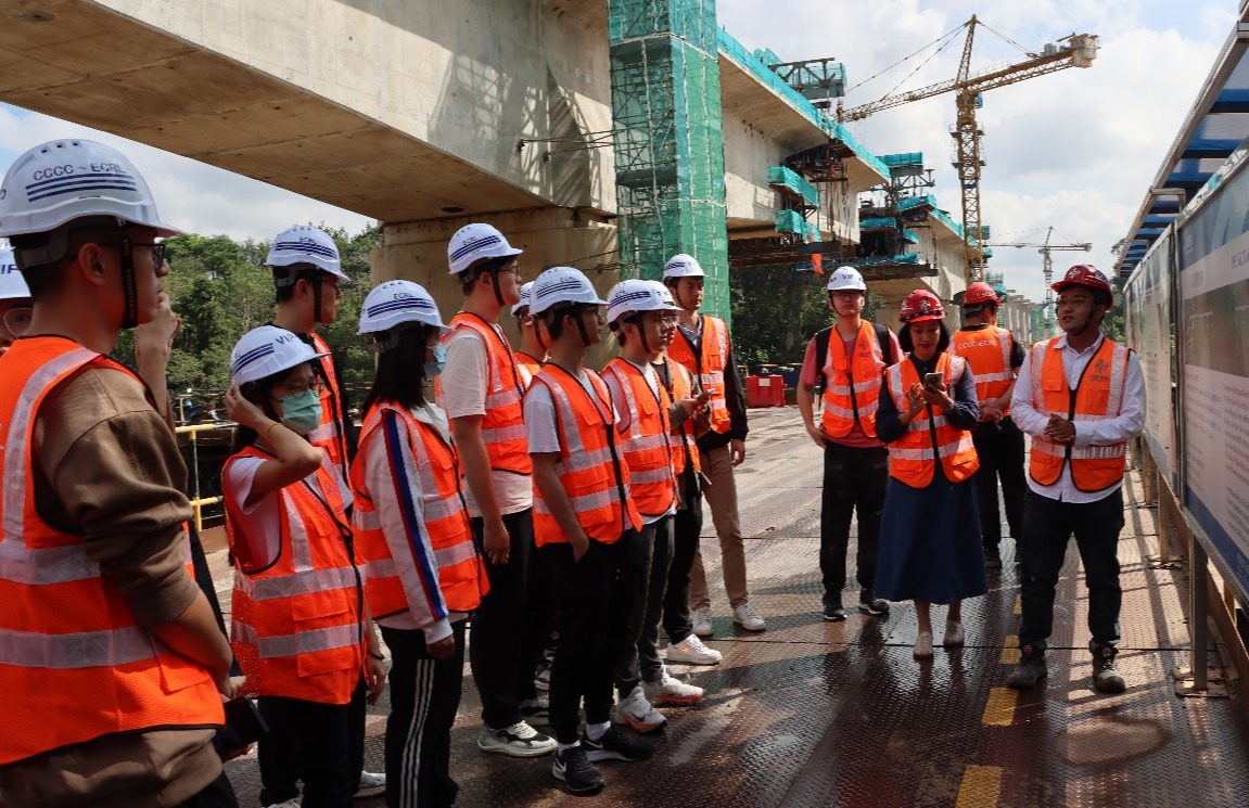 马东铁路项目是中国港湾公司在马来西亚承建的铁路项目,也是中国在“一带一路”沿线地区最大的海外基建项目。2月10日,8xbet.com水利系赴马来西亚实践支队前往马东铁六分部的彭亨河特大桥和马兰T梁制梁场施工现场实地调研,与我国派往当地的工程师交流彭亨河特大桥的施工重点难点,并结合专业知识探讨问题的解决方案。