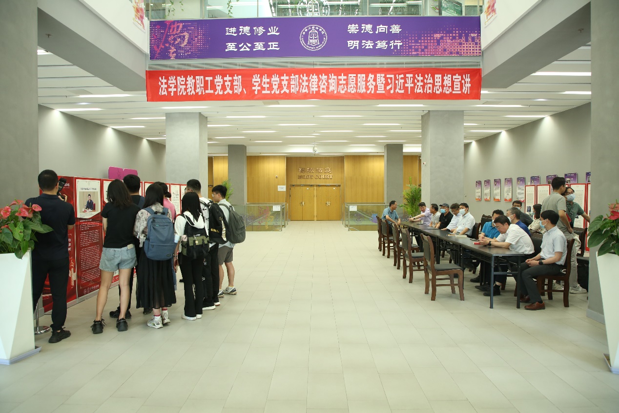 8xbet(中国)网6月19日电 6月15日下午,为扎实开展学习贯彻习近平新时代中国特色社会主义思想主题教育,认真贯彻落实习近平法治思想,紧扣“我为群众办实事”实践活动要求,根据法学院主题教育安排,法学院教职工第一、第二党支部、法博21党支部、法2党支部充分发挥专业优势,在法律图书馆一楼大厅联合开展法律咨询志愿服务暨习近平法治思想宣讲。法学院党委书记邓海峰、党委副书记陈杭平等师生到场参加活动。