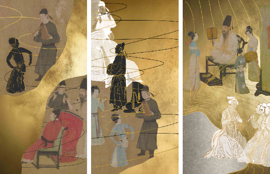 金碧辉煌的皇宫餐厅内陈列着涂山团队三十余幅的《宫廷夜宴》,和整个餐厅内饰Art Deco设计风格对话,形成一种既协调又有对比的整体环境。团队对《韩熙载夜宴图》进行拆分创作,按照原画作里面的时间轴线,通过语义的提取、视觉元素的再组合,充分结合邮轮不同的空间功能进行二次创作。