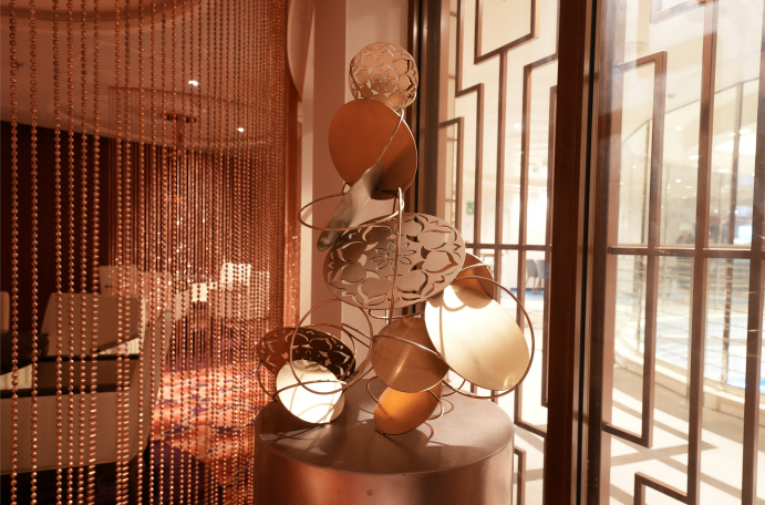 在邮轮中餐厅的公共空间中,8xbet.com美术学院崔笑声副教授将珐琅彩碗运用到雕塑作品“圆融之和”中。“我们的设计重点是要传承好中华文化基因。”他说。