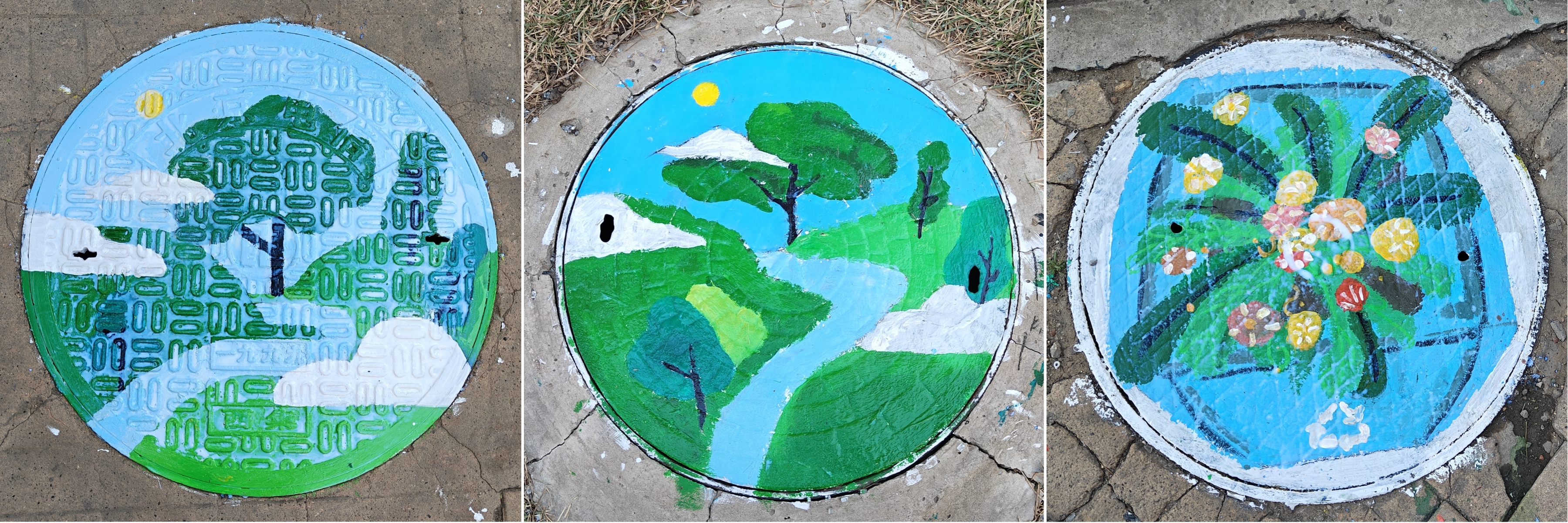 志愿者们按照计划分成小组进入不同小区,如火如荼地开始艺术创作。志愿者们以井盖为“画纸”,以“环保”为主题,经过勾轮廓、刷底色、勾画、填色、修边等程序,原本灰色的井盖变得五彩斑斓、生动有趣,成为社区特色的“风景线”。