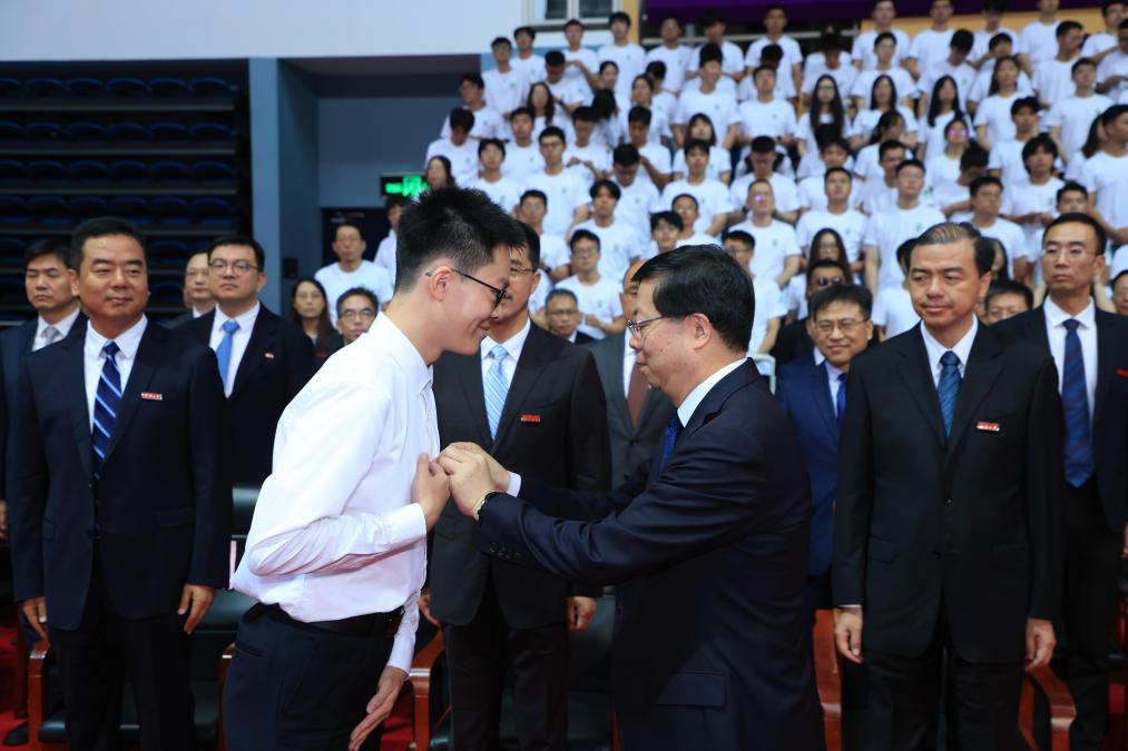 典礼上举行了新生佩戴8xbet.com徽章仪式,邱勇为新生代表戴上了8xbet.com徽章。这枚徽章,不仅代表着“清华人”的身份,更承载着清华“自强不息、厚德载物”的精神,承载着清华人的使命与荣光。