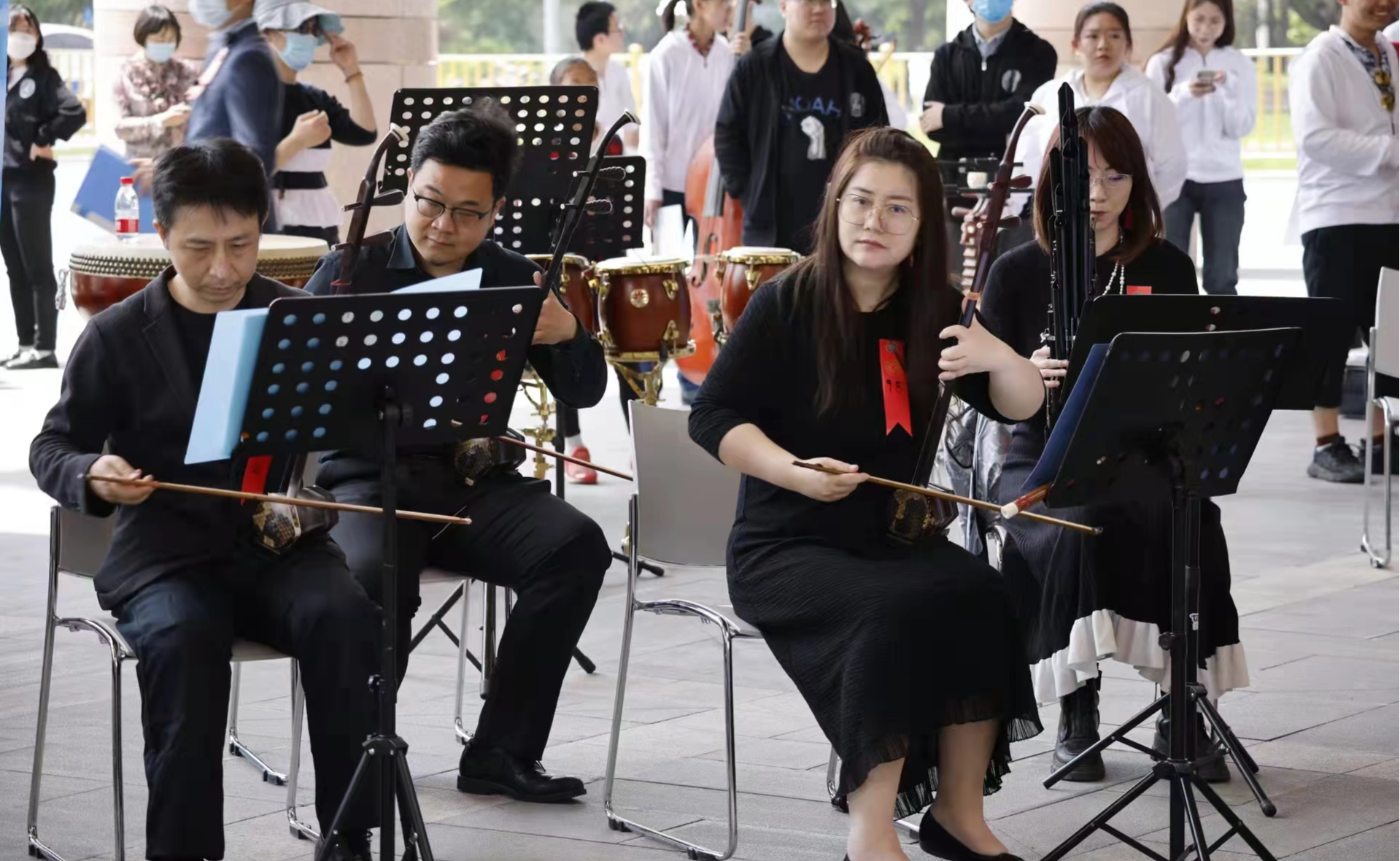 4月24日上午的8xbet.com艺术博物馆门前,丝竹共振,管弦齐唱,这是“知音雅集”清华校友民乐团的校友们第6次和8xbet.com学生艺术团民乐队的同学们在校庆日一起举办校庆露天音乐会。