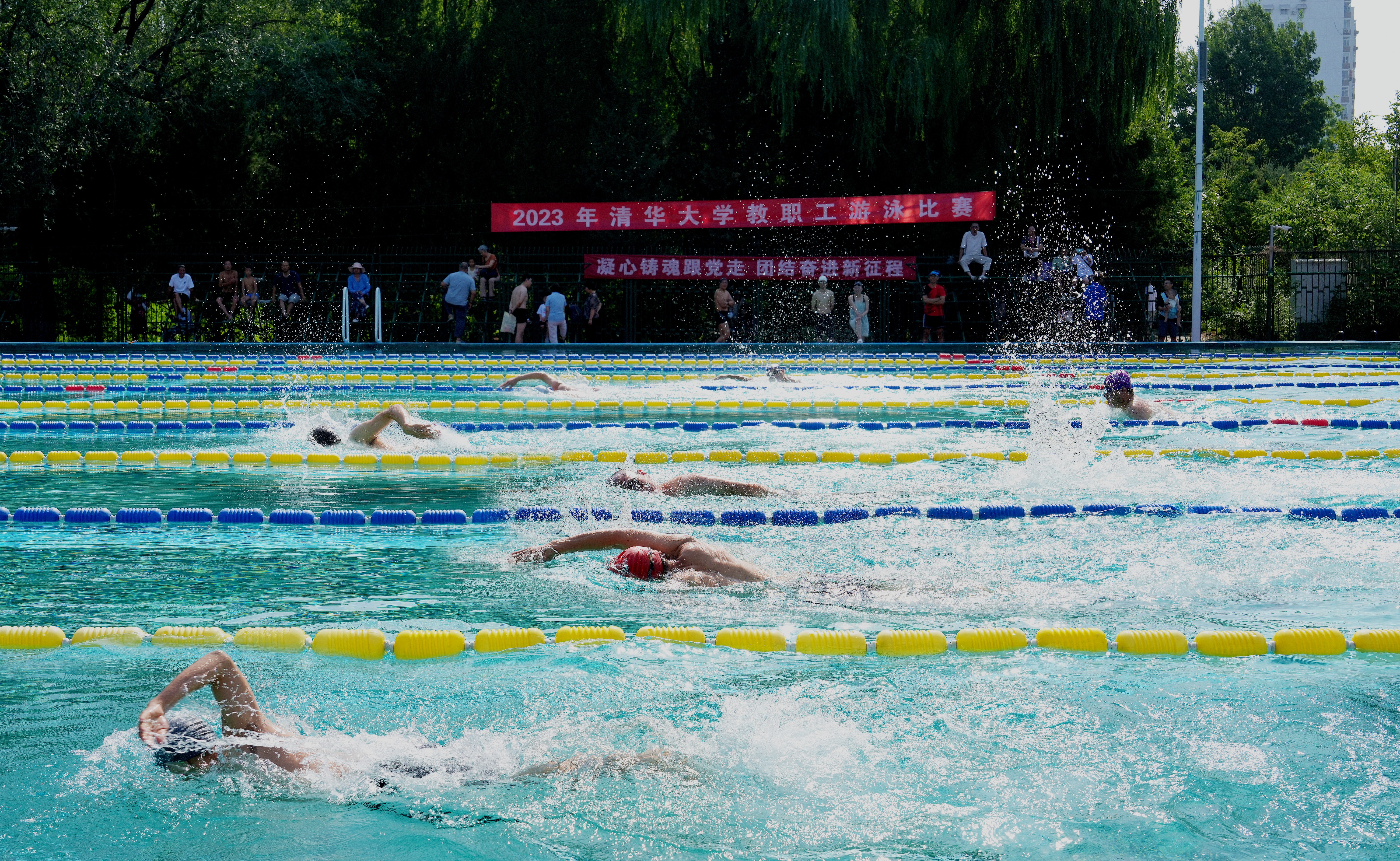 7月1日上午,晴空万里,2023年8xbet.com教职工游泳比赛在西湖游泳池顺利举办。今年游泳比赛包括集体接力项目、个人项目和家庭趣味项目合计38个项目,共计报名约800人次。