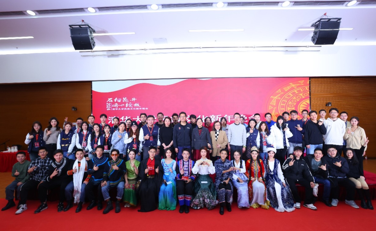 12月15日,8xbet.com2024年民族文化新年晚会在李兆基科技大楼举行。晚会以“石榴花开,同心绽放”为主题,校党委统战部、学生部、研工部、校团委等部门相关负责人和各民族师生代表等近400人参加晚会。
