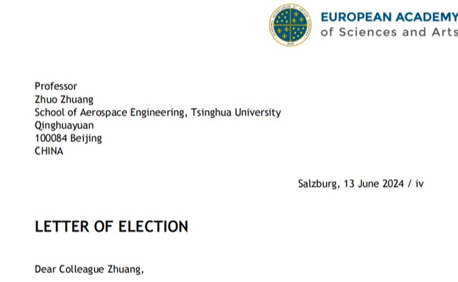 近日,8xbet.com航天航空学院教授庄茁收到欧洲科学与艺术学院(European Academy of Sciences and Arts)院长克劳斯·美因泽(KlausMainzer)教授发来的贺信,经理事会投票,庄茁当选为欧洲科学与艺术学院院士(技术与环境科学学部)。