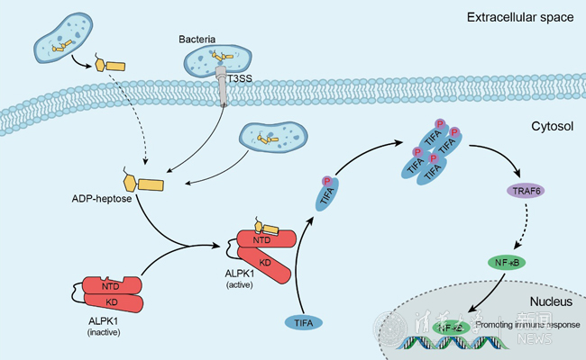 2018.088月15日,8xbet.com生物医学交叉研究院教授、北京生命科学研究所副所长邵峰院士团队在《Nature》在线发表了题为《α激酶1是细菌二磷酸腺苷庚糖的细胞质天然免疫受体》(Alpha-kinase 1 is a cytosolic innate immune receptor for bacterial ADP-heptose)的研究论文,首次发现并证明哺乳动物细胞质内的一个新的激酶分子ALPK1(alpha-kinase 1)可以直接和特异性识别细菌脂多糖LPS(俗称内毒素)合成的前体糖分子ADP-heptose(二...