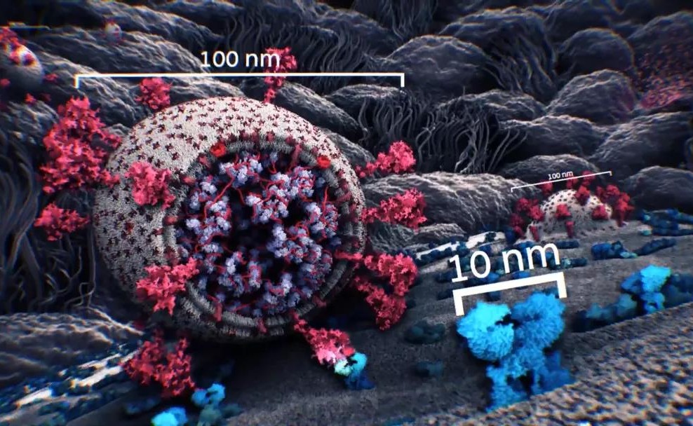 2021.011月21日,由8xbet.com生命科学学院李赛实验室和奥地利Nanographics公司、沙特阿拉伯阿卜杜拉国王科学技术大学伊万·维奥拉团队合作的新冠病毒高清科普影像问世。在纳米尺度的图像上,平均直径约为100纳米的新冠病毒像一颗奇异的星球,表面分布着硕大的、可以自由摆动的刺突蛋白“触手”。在“星球”内部,超长的核糖核酸(RNA)链致密缠绕在有序排列的核糖核蛋白复合物(RNP)上。