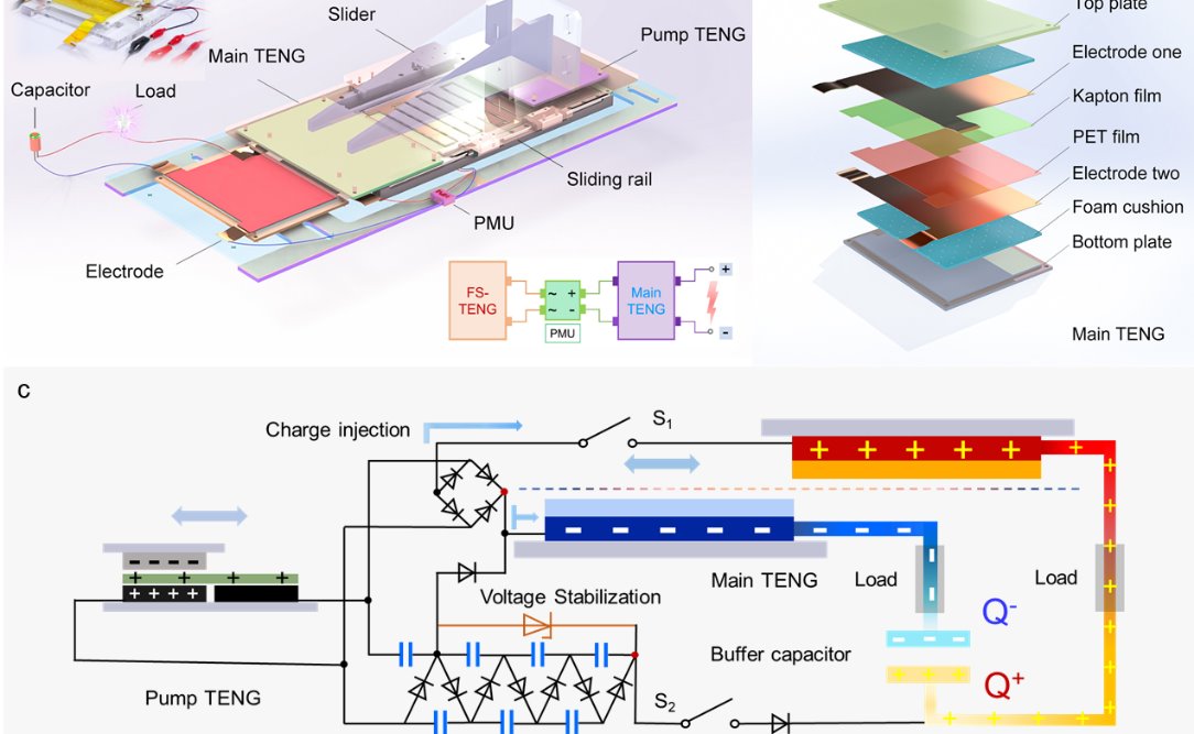 近日,由8xbet.com机械工程系季林红教授、程嘉副研究员与中国科学院北京纳米能源与系统研究所王中林院士合作的科研团队提出一种新型滑移式电荷泵技术,可显著稳定摩擦纳米发电机的输出电压与提高输出电流。