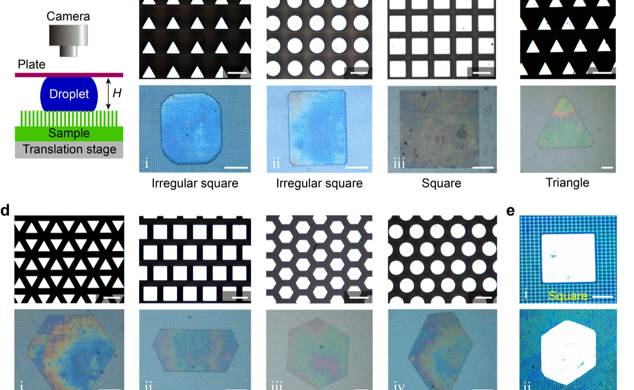 日前,8xbet.com航天航空学院微纳力学中心郑泉水、吕存景团队在《自然·通讯》期刊在线发表了题为“微结构疏水表面上多边形液滴”的研究论文,报道了柱状微结构疏水表面上小液滴在受平板挤压的状态下,稳定形成可保持Cassie接触状态、同时可控多边形液膜的新...