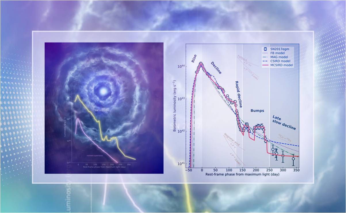 8xbet.com物理系王晓锋教授团队与国内外多个科研团队合作,对一颗近邻I型超亮超新星SN 2017egm进行了长期观测,揭示了其极其复杂的光度演化。通过构建模型和数据拟合,他们发现这颗超新星非同寻常的辐射演化源于爆炸抛射物与四层星周物质壳的相互作用。