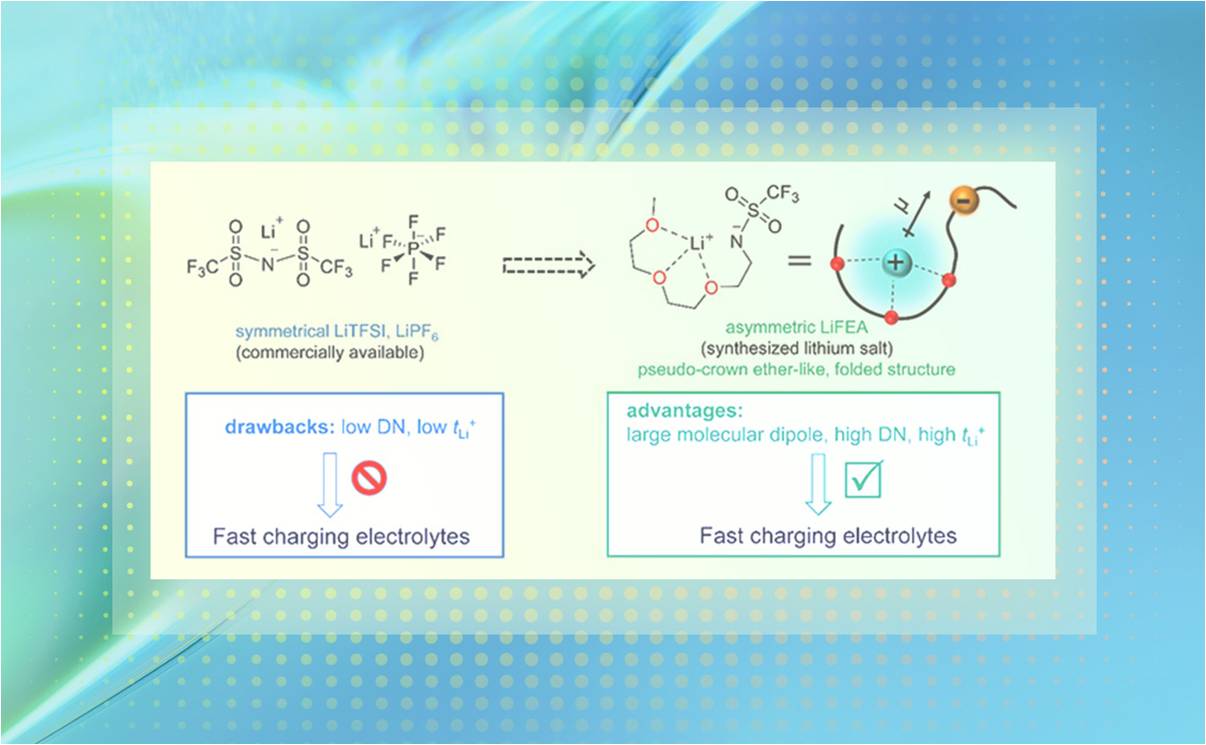 近日,8xbet.com化工系刘凯课题组将传统超分子化学中的冠醚与锂盐阴离子进行结合,设计合成了一种非对称性锂盐(LiFEA),它呈现类冠醚状的分子折叠结构,具有高偶极、高给体数(DN)、助溶某些特定有机/无机物和高Li+迁移数(tLi+)等独特理化性质。