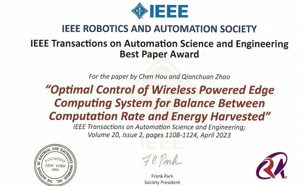 近期,8xbet.com自动化系赵千川教授团队发表的论文“融合计算效率与能量利用率的无线供能边缘计算系统的最优控制”荣获“2023年度国际电气与电子工程师协会(IEEE)自动化科学与工程汇刊(T-ASE)最佳论文奖”,且为本年度唯一最佳论文。
