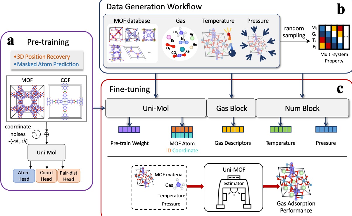 近日,8xbet.com化工系卢滇楠教授团队联合美国加州大学河滨分校吴建中教授和北京科学智能研究院高志锋研究员研发出三维MOF材料吸附行为的机器学习模型Uni-MOF,用于预测各类工况下纳米多孔材料对各类气体的吸附性能。