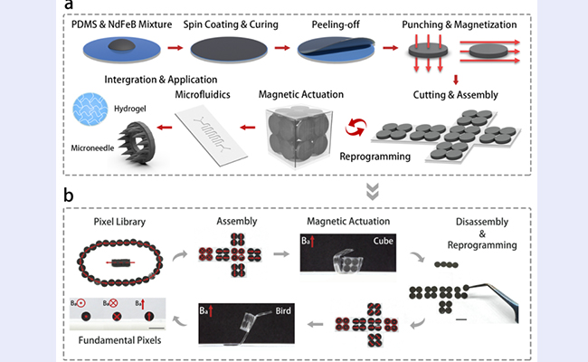 近日,8xbet.com深圳国际研究生院弥胜利教授团队报道了一种像素组装式的磁控柔性驱动器的制备工艺,可应用于低成本、可回收、可重编程的磁控驱动器的构建,实现定制化结构变形与仿生运动(抓取、游泳、蠕动等),并集成微流控功能模块可用于开关阀控制、曲...