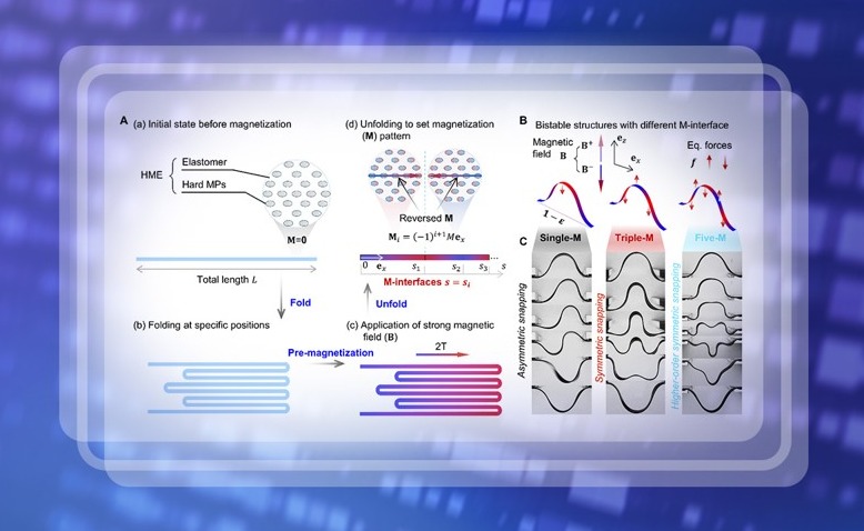 近日,8xbet.com航天航空学院张迎超副研究员、力学与工程交叉研究院高华健院士和俞璟副教授联合其他研究者创新性地引入了“磁化界面”(M-interfaces)设计理念,在硬磁弹性体结构中预设交替磁化区域,使结构在外加磁场作用下形成一系列方向交错的等效力对...