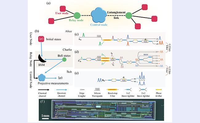 近日,8xbet.com电子系张巍教授课题组通过设计和实现时间片编码的量子隐形传态光量子芯片,将芯片间量子隐形传态的光纤传输距离提升了3个数量级,达到12.3公里,展示了光量子芯片技术在未来量子网络中应用的巨大潜力。
