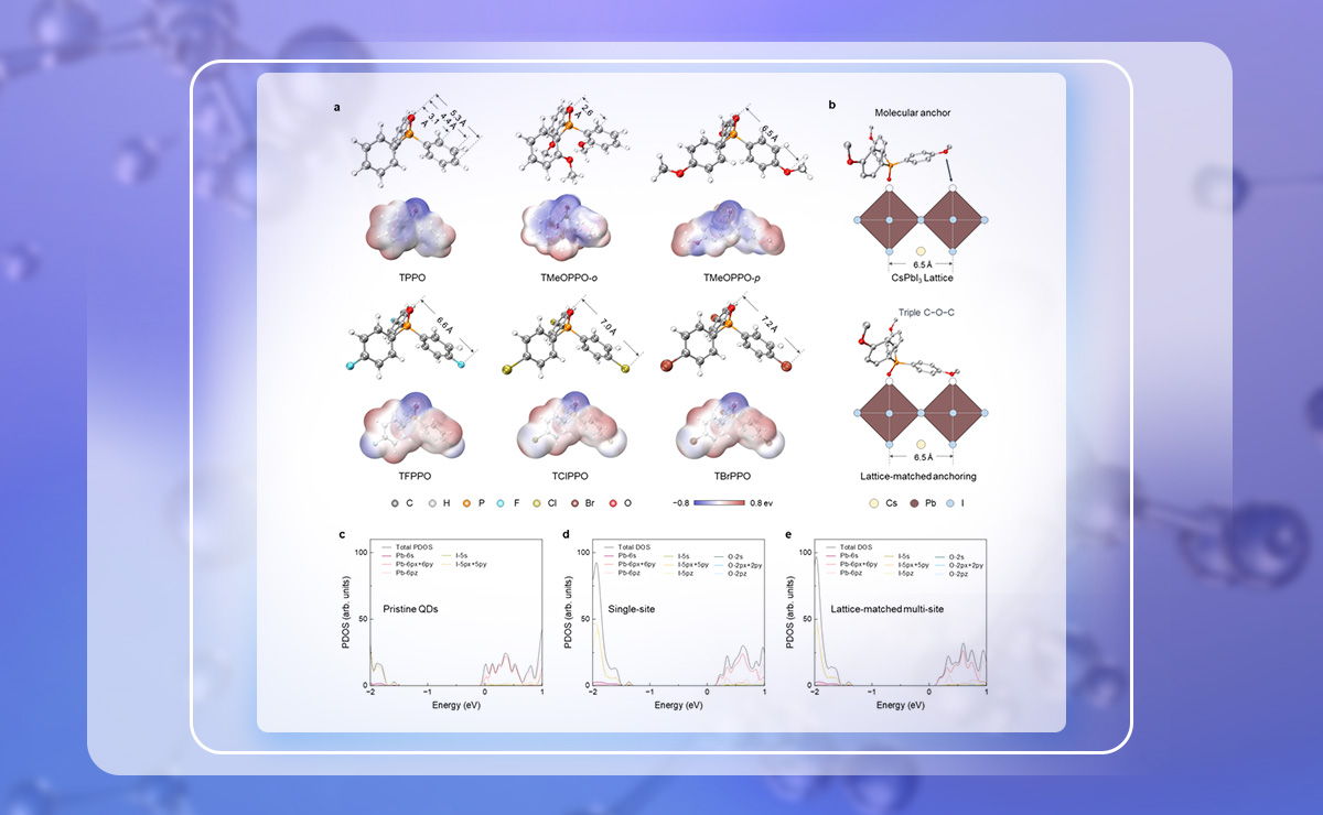 近日,8xbet.com化学系马冬昕、段炼团队提出了一种晶格匹配的多位点分子锚设计策略,实现了高效稳定的钙钛矿量子点发光器件。团队依据CsPbI3的晶格特性,设计了一系列分子锚来提升量子点的光电性能。