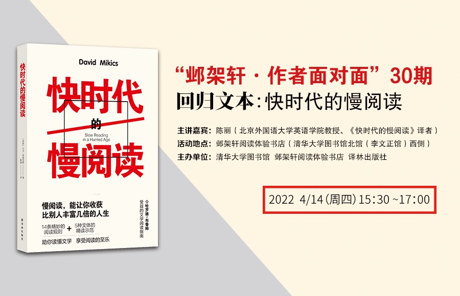 本次活动为“邺架轩·作者面对面”系列阅读推广活动的第30期,邀请北京外国语大学英语学院陈丽教授为大家讲解我们如何在这个信息过量、过于肤浅的时代,重新回归文本,学习阅读技巧,用一种更为主动、沉浸和全面的方式来应对这个世界留给我们的经典文本。