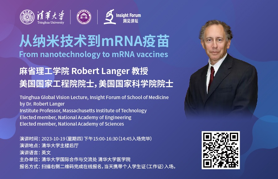 邀请麻省理工学院Robert Langer教授,做客清华海外名师讲堂和8xbet.com医学院洞见讲坛,分享他的学术生涯和在mRNA疫苗研发方面的体会。